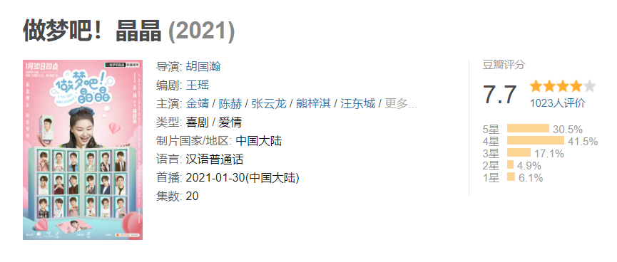 然而從結果看,有李佳琦“帶貨”,有20位男藝人客串出演各單元的“盲盒男友”,有抖音、真樂道以及滴滴旗下粒粒橙傳媒整合各方資源力推(如滴滴開屏廣告、滴滴車載屏上二輪播出)的這部新劇,除開播之初登上過一次微博熱搜外便再也沒能走出抖音。豆瓣評分算不錯,但打分人數勉強破千。