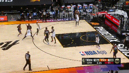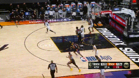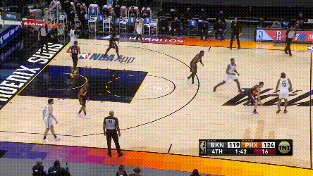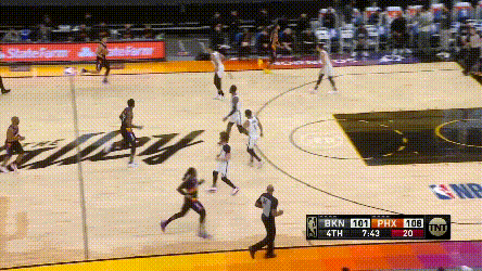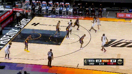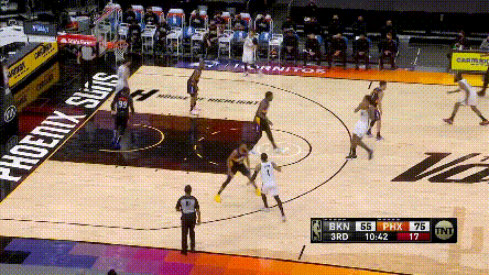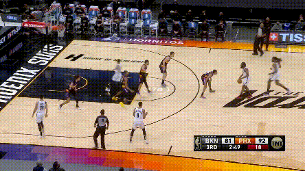**第一,太陽下半場沒有懲罰到籃網銜接段的小陣容,反而在這個時間段犯了一些錯誤。**作為一支中距離實力強勁的球隊,太陽沒有特別怕小喬丹,但籃網用無大中鋒的換防型陣容時,太陽反而打不到痛點了。保羅和布克都不是暴力衝筐的打法,讓籃網小陣容的護筐弱點被掩藏了。
