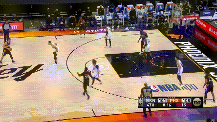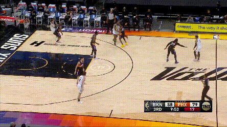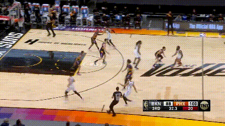 太陽的防守也犯了一些莫名其妙的錯誤。籃網的小陣容——格林,沙梅特,布朗,盧瓦烏,泰勒——沒啥正經的主攻手,對太陽籃筐的衝擊威脅沒有很大,但太陽卻很奇怪的在兩次退防中堆兵力在上線而漏掉了底角。