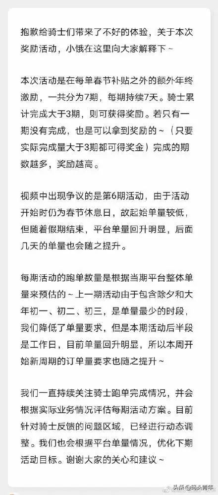 想黑了騎手春節獎勵?餓了麼道歉,奇葩的是不補錢只補“活動”_風聞
