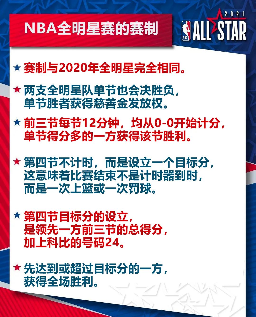 至於賽制,完全照搬上賽季全明星賽,並且砍掉了所有的場外活動,全明星賽、扣籃比賽、技術挑戰賽和三分大賽合併到一個晚上進行。