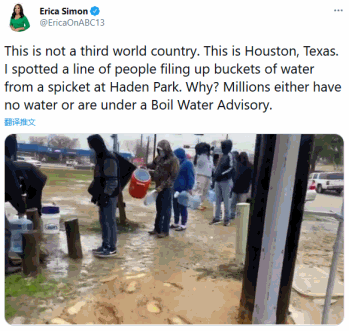 ABC記者Erica Simon昨天發佈了一則人們排隊打水的視頻,驚呼“這可不是什麼第三世界國家,這裏是休斯頓!”