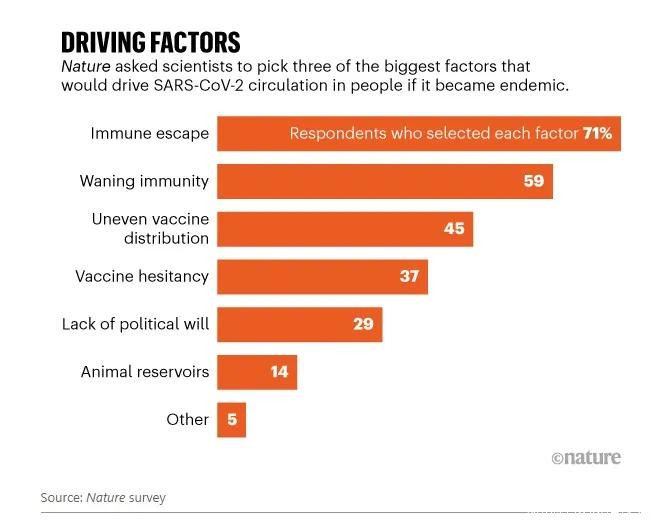 但我們依舊不能對此掉以輕心。《自然》在調研中請科學家們選擇驅動新冠病毒持續傳播的最主要原因,高達七成的科學家選擇了免疫逃逸。這在冠狀病毒裏並不罕見——從新冠之前就存在的幾種冠狀病毒來看,感染過一些普通冠狀病毒的人,之後還會重新感染。而幾十年前產生的中和抗體,對於現有的流行毒株的保護力有所下降。這一點和新冠病毒非常類似。也正是因為這個原因,至少有3種冠狀病毒已在人羣中傳播了數百年之久。