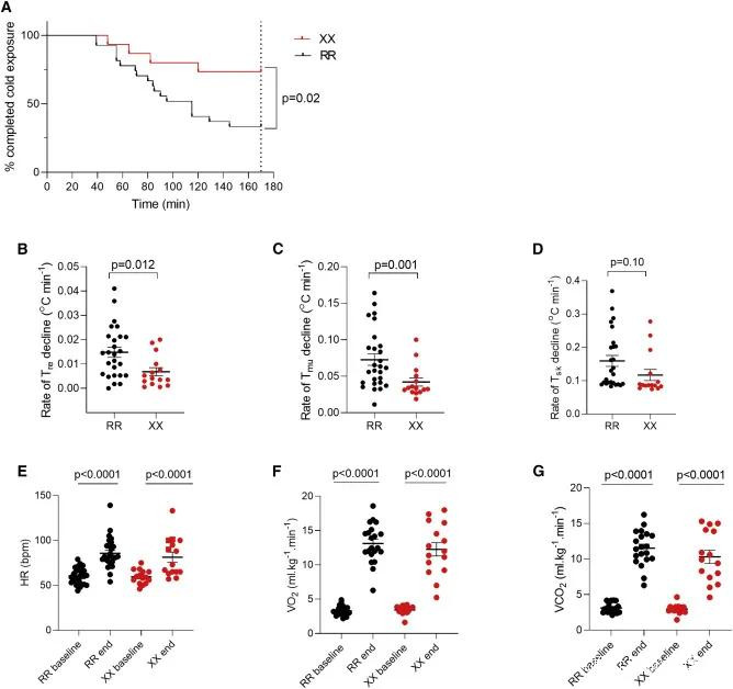 參與者無論是缺乏α-輔肌動蛋白3(XX)還是具有ACTN3(RR),都浸泡在14℃的水中20分鐘,並在室温空氣中停頓10分鐘,然後繼續浸泡於冷水中,直到直腸温度達到35.5°C,或總共持續120分鐘(包括停頓在內的170分鐘)。在完整的冷水暴露過程中,XX組(69%)能夠將體温維持在35.5℃以上的個體比例明顯高於RR組(30%)。平均而言,α-輔肌動蛋白3的喪失導致直腸和小腿肌肉的體温下降速度減半。