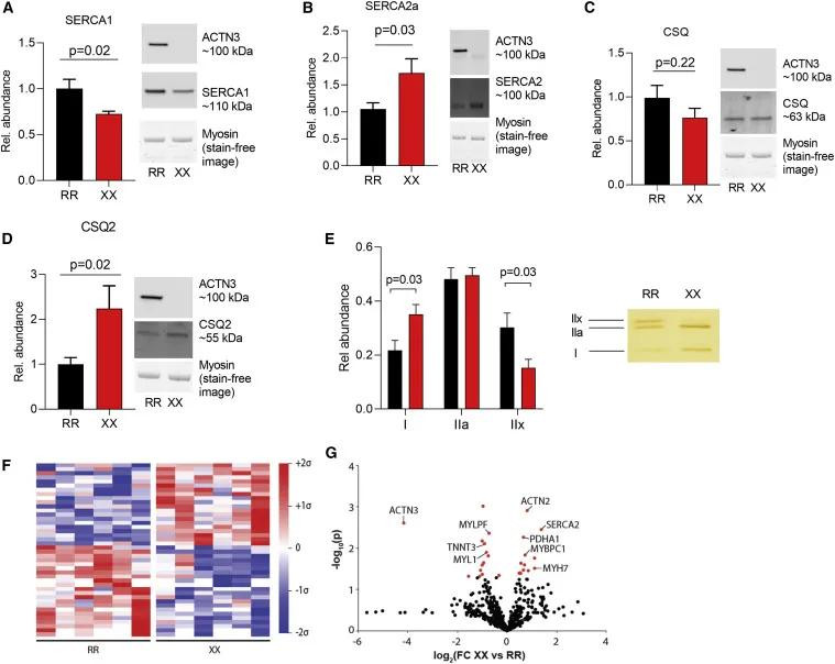 SERCA在哺乳動物組織中以幾種不同的亞型表達,SERCA1和SERCA2a分別是成年快肌纖維和慢肌纖維中的主要亞型。值得注意的是,研究人員檢測到從RR肌肉中的SERCA1到XX肌肉中的SERCA2a的優勢轉變(圖A和B )。SR Ca2+儲存蛋白CSQ也顯示出纖維類型依賴性的亞型分佈,CSQ1在快肌纖維中占主導地位,CSQ2在慢肌纖維中占主導地位。研究人員觀察到在XX和RR肌肉中CSQ的總表達量相似,而在XX中CSQ2的表達量是RR肌肉的兩倍左右(圖C和D)。