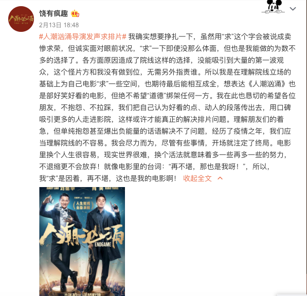 面對這樣殘酷的春節檔,導演饒曉志在大年初一、初二連發微博,承認自己與片方在宣發營銷的失職導致預售表現萎靡,隨後懇求影院方、業界同仁多多給予《人潮洶湧》關注,並再次拿出《無名之輩》的情懷牌,以爭取最後的逆襲機會。《人潮洶湧》官方微博也一改此前有意迴避《無名之輩》關鍵詞,多條文案都在刻意提起《無名之輩》的黑馬主題,以求喚起影迷觀眾們的情懷記憶點。