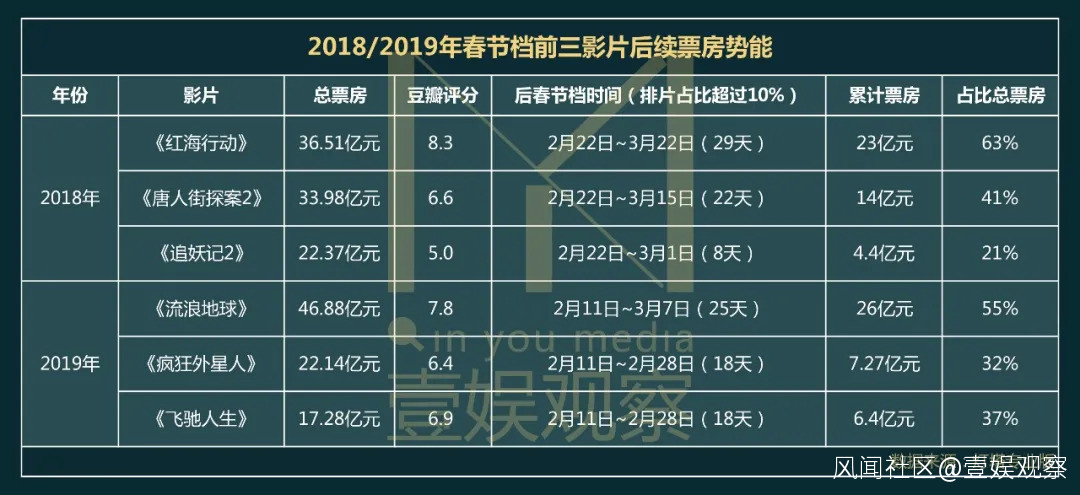其中,《流浪地球》在後春節檔時間內累計收穫26億元,佔比總票房55%,而《紅海行動》則達23億元,佔總票房的63%。由此可見後春節檔週期票房對高口碑春節影片來説至關重要。