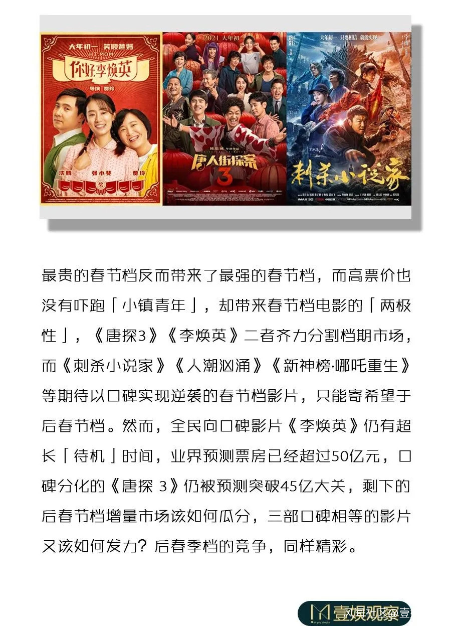 這意味着,全民向口碑影片《你好,李煥英》仍有超長“待機”時間,業界預測票房已經超過50億元,兩極分化的《唐探3》仍被預測突破45億大關,而《刺殺小説家》《人潮洶湧》《新神榜·哪吒重生》等期待以口碑實現逆襲的春節檔影片,也有足夠的空間來營銷後期勢能。