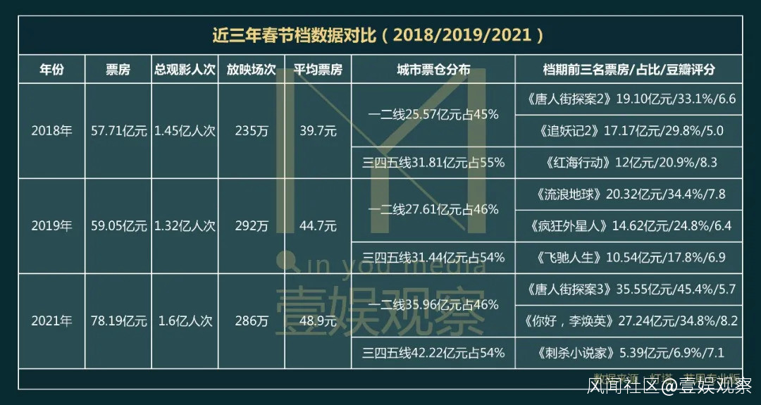 壹娛觀察(ID:yiyuguancha)整理了三年(2018/2019/2021年)春節檔數據,通過圖表可以直觀看出,2021年春節檔在檔期各項數據都得到了顯著提升,並將春節檔期的潛力進一步挖掘。