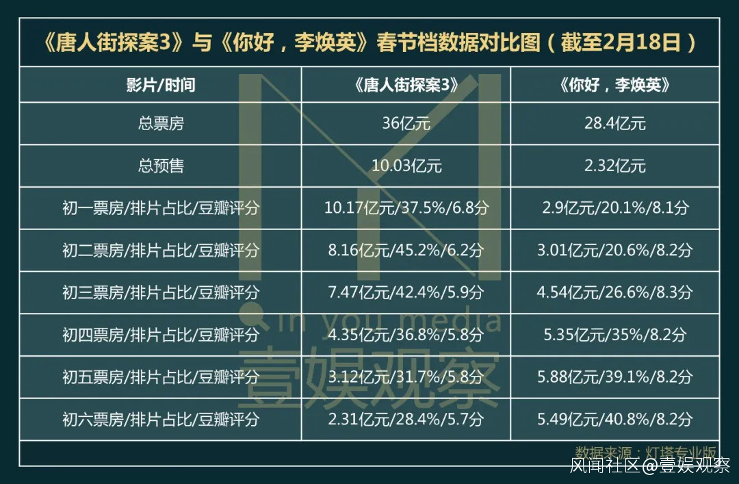 回到春節檔兩部頭部影片上,如果説《唐探3》依靠破紀影史紀錄的預售成績和首日表現點燃了整個春節檔勢能,可是伴隨着後期口碑勢微,整體票房“高開低走”,難以保證春節檔長尾效應,那麼,《你好,李煥英》就強勢拾起接力棒,逆襲上位,撐起了春節檔的漲幅重任。“李煥英”的無限可能,也成了接下來的業內的重點話題。