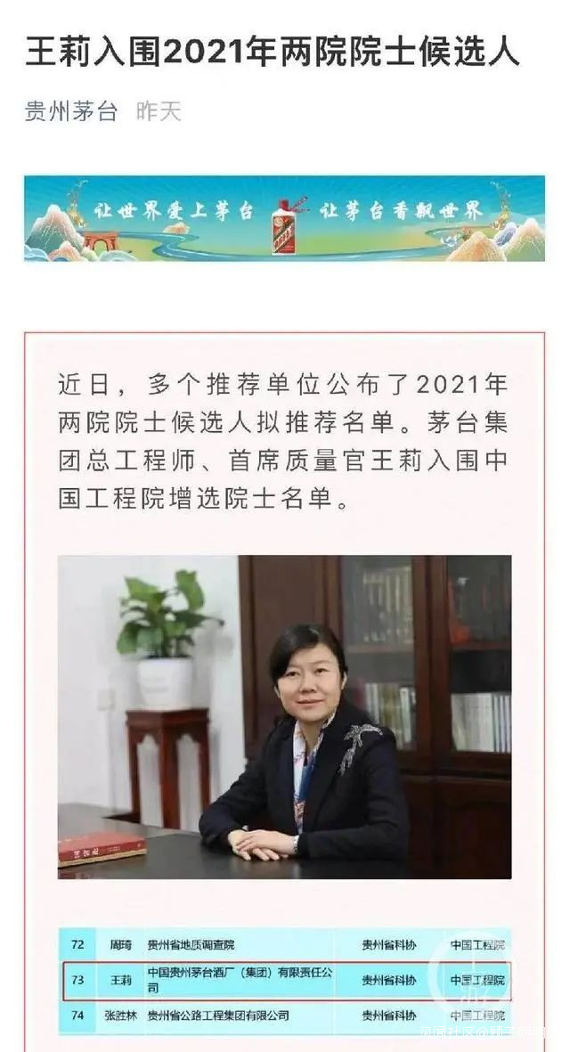昨天,貴州茅台在官方發佈,集團總工程師、首席質量官王莉,這位中國首席白酒品酒師,入圍中國工程院增選院士候選名單。