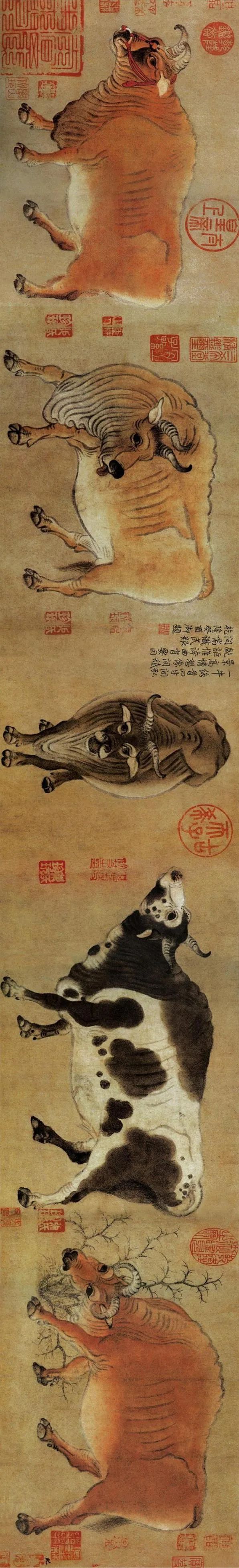 在與牛有關的文物中,最著名的應該是現藏於北京故宮的《五牛圖》了,它是現存最早的紙本國畫,堪稱鎮國之寶。五牛圖自問世後,歷代傳承有序,清代被收入宮中。八國聯軍侵華,五牛圖被劫掠出國,一度下落不明。20世紀五十年代,在周恩來總理親自關心過問下,國家花費鉅額外匯將其贖回。五牛圖的經歷本身就是一個傳奇故事。
