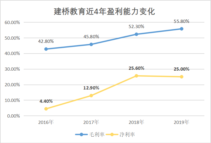 回顧建橋教育近4年的營收,一直是持續增長的狀態。其中2017年上漲幅度最大,實現同比增長22%。