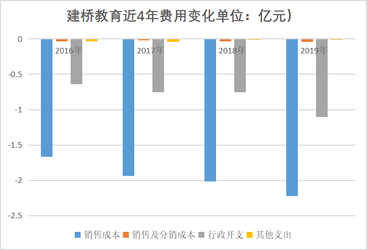而學員規模增加,也客觀上導致了費用開支的持續增長。近4年,建橋教育銷售成本和行政開支持續增加,其中銷售成本在2019年達到2.22億元,行政開支達1.1.億元。