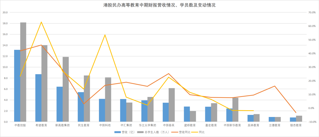 由下圖可見,營收體量和總學生人數排在中線及中線之前的均為民辦高校集團。而建橋教育作為單體高校,很難躋身前列。