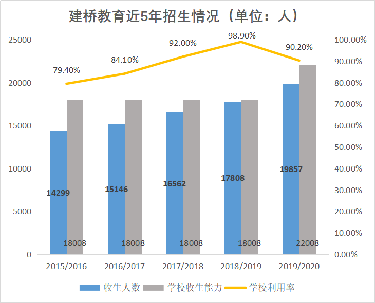 2019/2020學年,建橋教育約2萬人,相較於去年同期增長12.4%,校園利用率90.2%。建橋教育的收生人數在近5年有明顯增長的趨勢,尤其2018/2019學年,增長幅度最大。