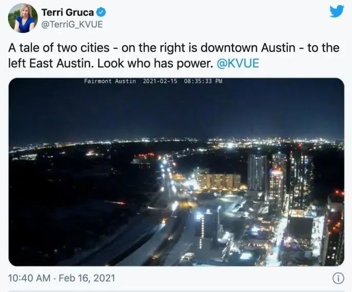 這是幾張在推特上廣為流傳得州首府奧斯汀市的圖片,市中心明亮炫目,燈火不熄。停電,似乎根本不存在。