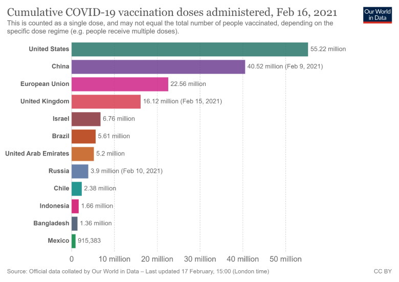 根據Our World in Data最新統計數據,截至2021年2月16日,全球已經接種超過1.83億劑新冠疫苗。其中美國接種人數最多,達5522萬劑,中國位列其次,2月9日的數據為4052萬劑。