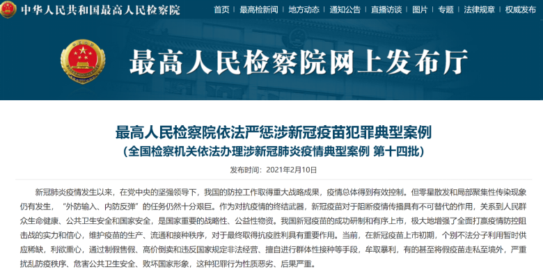 隨着國內新冠疫苗接種鋪開,一些犯罪行為悄然滋生。有人利用疫苗暫時供應稀缺,通過製造銷售假疫苗,高價倒賣,牟取暴利。據最高人民檢察院(下簡稱“最高檢”)網上發佈通報,截至2021年2月10日,全國檢察機關共在21起案件中依法批准逮捕70名犯罪嫌疑人。官網公佈了其中4例典型案件。