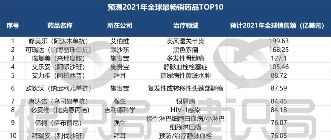 預測中的十大熱門藥物分別是:修美樂、可瑞達、瑞復美、艾樂妥、艾力雅、歐狄沃、喜達諾、必妥維、億柯、拜瑞妥。