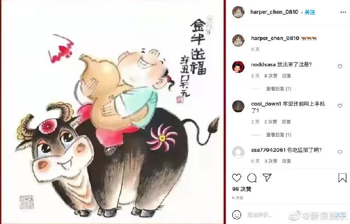 此前陳昱霖被羈押於朝陽區看守所兩年多,目前已經出獄。6天前,陳昱霖還曾在社交平台曬照迎接新年,不過秒刪了一張個人自拍。