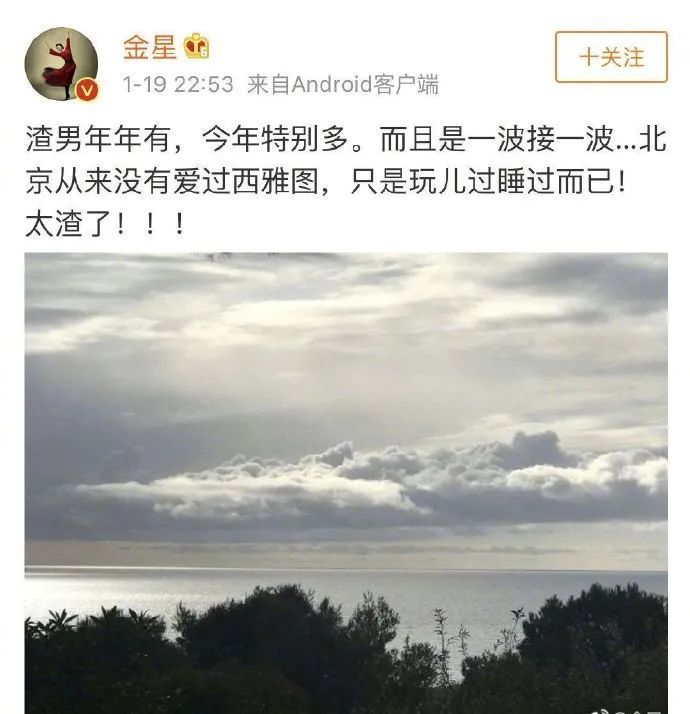 金星也發微博罵吳秀波:渣男年年有,今年特別多,北京從來沒愛過西雅圖,只是玩過睡過而已,太渣了。