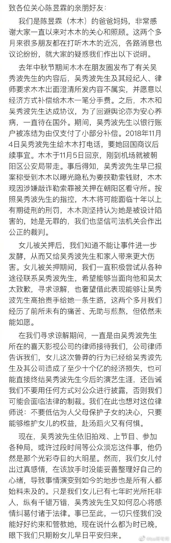 2019年1月,陳昱霖的父母髮長文,控訴吳秀波。原來,在陳昱霖和吳秀波分手後,她一直待在國外,吳秀波要她出面,説自己寫的都是假消息,作為補償,願意給她一筆分手費。