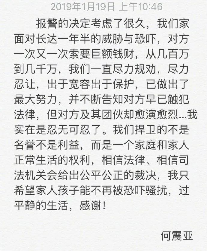 隨後,吳秀波的妻子何震亞發聲明,維護丈夫,説夫妻和孩子都遭到了陳昱霖的恐嚇和威脅。