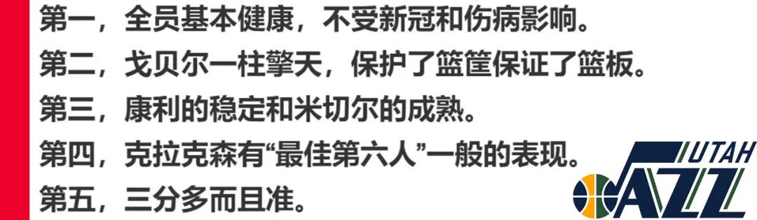 由於沒怎麼受到新冠隔離的影響,爵士一直保持陣容完整,位置齊全:戈貝爾/羅伊斯·奧尼爾/博格達諾維奇/米切爾/康利,費沃斯/英格爾斯/尼昂/克拉克森。這9個人可以拼插出各種組合,沒有一點有明顯缺陷。