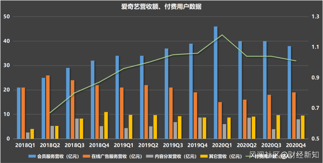 2018年上市之初,愛奇藝的營收結構一度是相對健康的會員付費+在線廣告雙支柱結構。甚至二季度廣告營收一度超越會員營收。而從2020年營收情況看,會員營收與廣告營收六二開的結構基本固化下來。