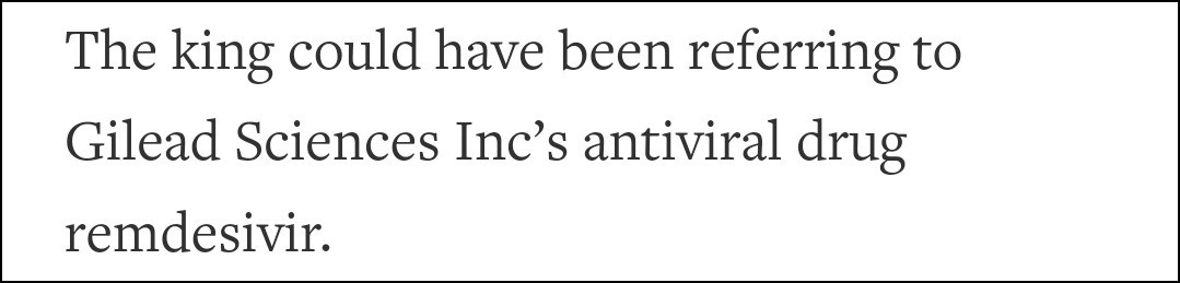 當然也需要強調的是,姆斯瓦蒂三世所使用藥物系瑞德西韋僅為路透社一家的猜測。