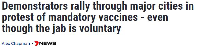 澳大利亞“7新聞”稱,當日在阿德萊德和珀斯等地,也有類似的反疫苗集會。儘管大多數抗議者是反對“疫苗接種強制化”,但也有人抗議疫苗本身。抗議者呼籲,澳大利亞民眾應該從下週一開始“自願地收起袖子(抵制疫苗接種)”。