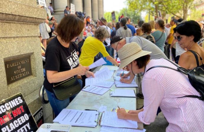 民眾在阿德萊德議會大廈前簽字請願反對“強制接種” 圖源ABC