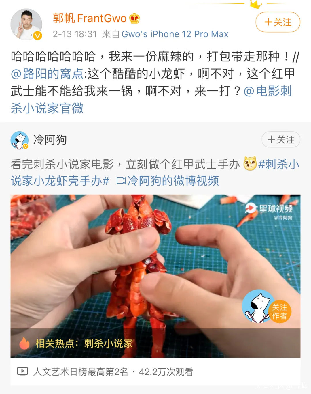 漫畫博主@大綿羊BOBO看完電影后,創作了《李煥英》卡通頭像,話題#你好李煥英小頭像#登上微博娛樂榜。設計美學博主@冷阿狗 製作了《刺殺小説家》雷佳音飾演角色的創意模型,不僅收穫了路陽、郭帆關注,還被兩位導演排着隊調侃玩梗。點開話題#唐探名場面模仿#,你能收穫一大堆模仿思諾、宋義(唐探角色)的趣味內容。