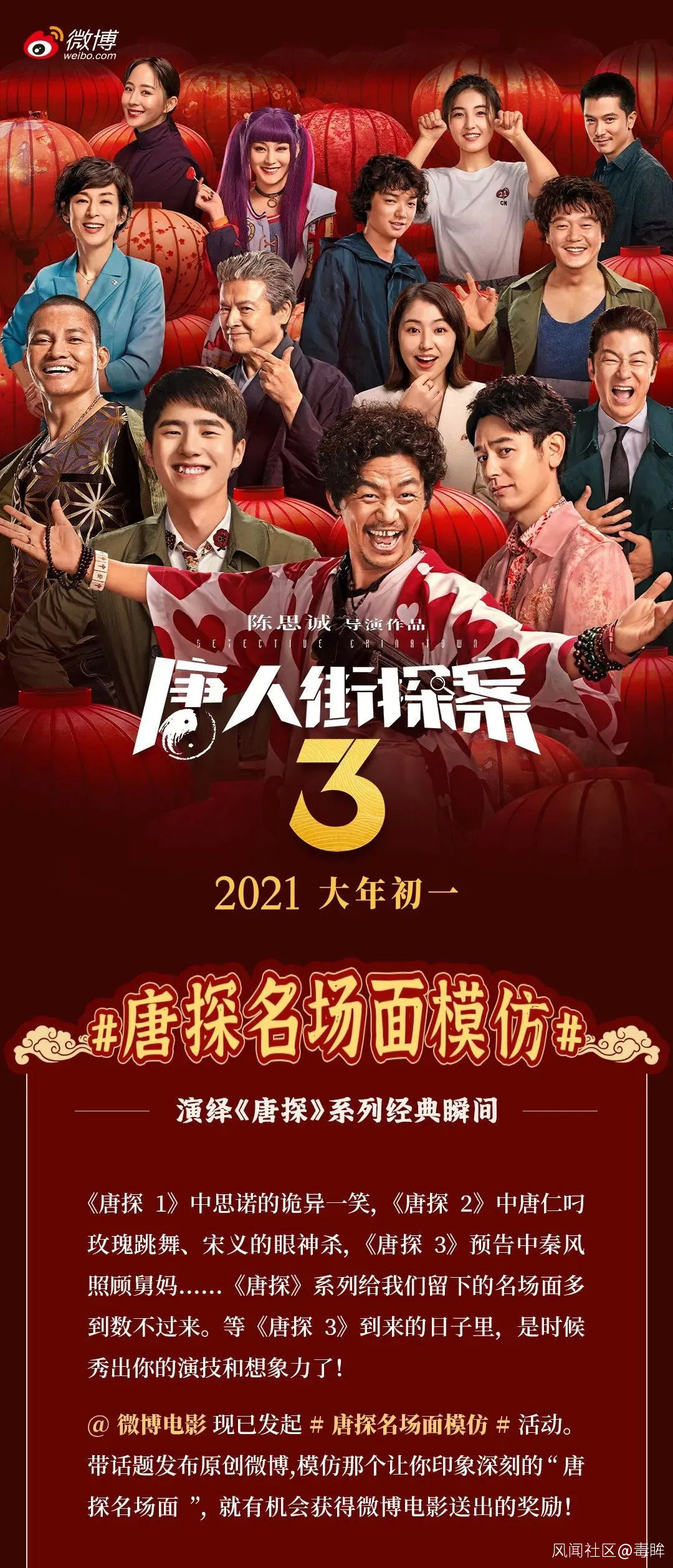 微博電影和《唐探3》官博共同發起了#唐探名場面模仿#,邀請影迷帶上話題模仿電影中經典場景,贏取獎品。獎品包括現金紅包和電影周邊。