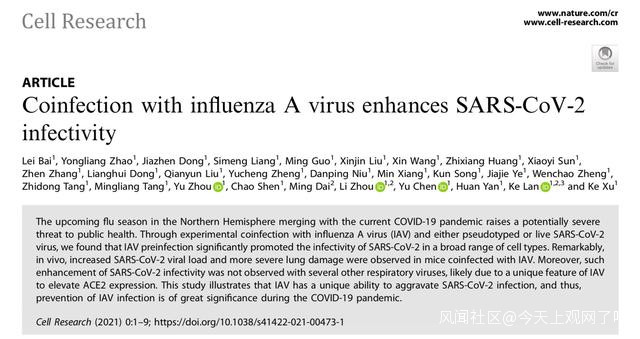 武漢大學病毒學國家重點實驗室、生命科學學院徐可教授和武漢大學病毒學國家重點實驗室主任、生命科學學院教授藍柯為共同通訊作者。《細胞研究》是中國本土成長起來、亞太地區生命科學領域期刊影響因子最高的國際期刊。研究團隊首次報道了流感病毒能顯著促進新冠病毒感染,並通過構建流感病毒和新冠病毒共感染小鼠模型發現兩種病毒共感染在小鼠體內引發更嚴重的疾病,該論文還對流感病毒促進新冠病毒感染和致病的分子機制進行了深入研究。