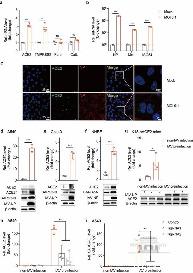 流感與新冠病毒共感染會引起ACE2轉基因小鼠產生更嚴重的肺部病理損傷和更高的新冠病毒載量。在新冠病毒受體人ACE2轉基因小鼠中,流感與新冠病毒共感染會引起更嚴重的肺部病理損傷和更高的新冠病毒載量。隨後,研究團隊聚焦在新冠病毒入侵關鍵受體ACE2上。實驗結果表明,流感的單獨感染會引起ACE2表達水平輕微上調(2-3倍),但流感與新冠共感染則會強烈上調ACE2表達水平(約20倍)。研究認為,流感病毒感染通過啓動ACE2的表達並促進其後的加速表達過程,從而加重新冠病毒的感染。