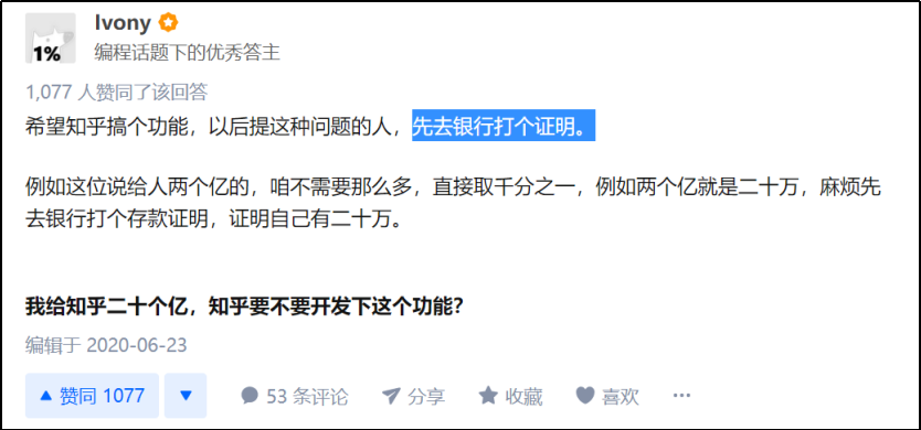 説經典,一個是因為推動開啓了“知乎宇宙”的討論,讓很多人只要膽子大,什麼金額都能在知乎裏給你印出來。