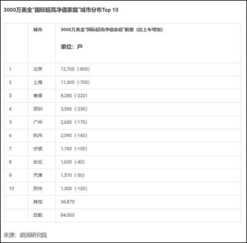 從胡潤2019年財富數據報告上可以看出,全國擁有3000萬美元資產的家庭總數為8.4萬户,北上廣深+香港佔據了3.8萬户,除此之外的城市佔據了4.6萬户。