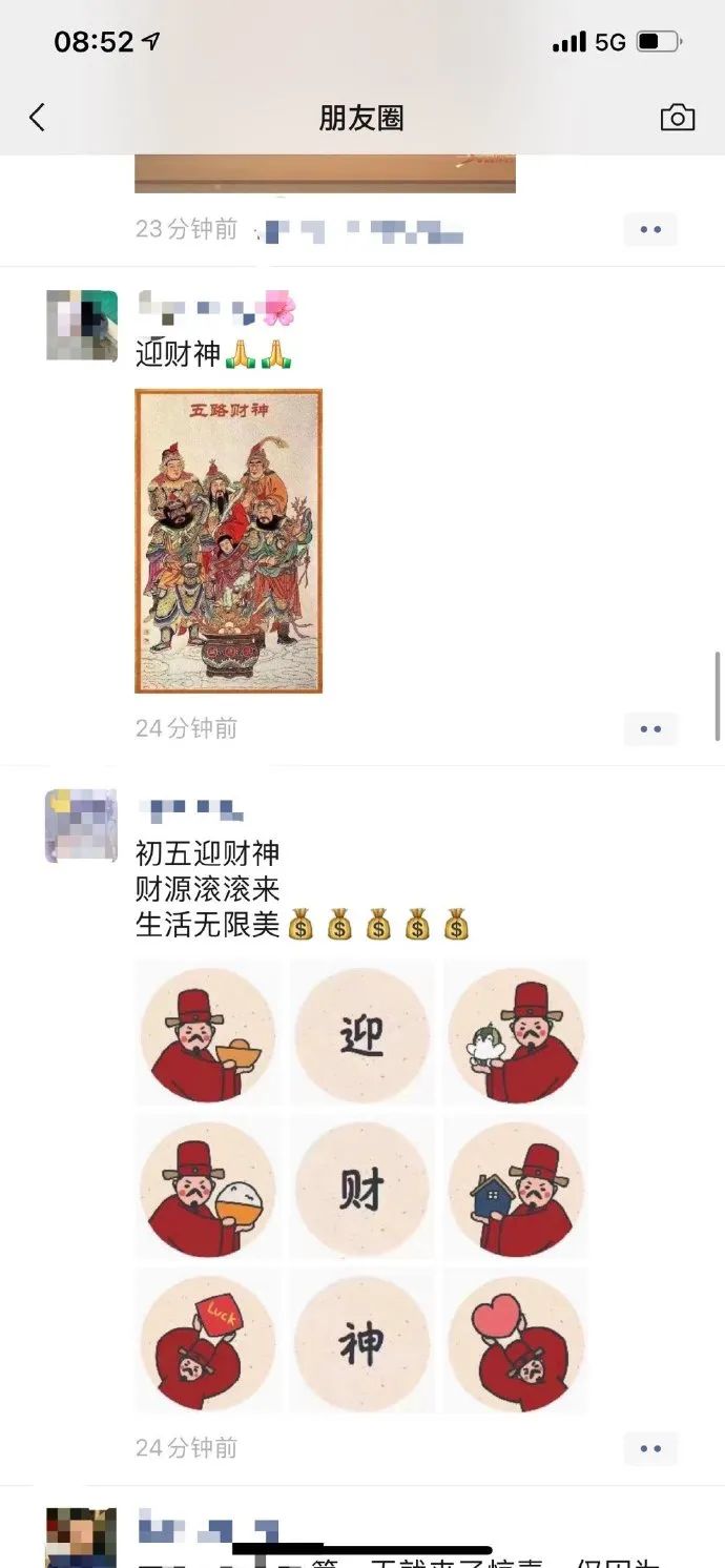 相比於曬年夜飯,祝大家新年快樂,我朋友圈的人,更熱衷於發財神。乃至於年初五那天我在朋友圈看到了花樣繁多的種種財神一遍遍刷屏: