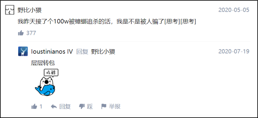 説時遲那時快,果真有答主揭露了層層吃回扣的現象,到他這裏實際被蟑螂追殺的價格只有100萬了。