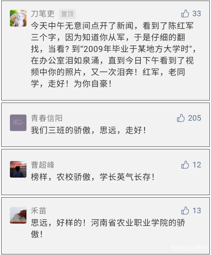 文中稱,河南農業職業學院2014級汽修3班學生肖思遠,在邊境衝突中誓死捍衞國土,因公殉職,被中央軍委追記一等功。青春熱血灑崑崙,赤膽忠誠只為國。大好河山,寸土不讓!河南農業職業學院全體師生,向英雄致敬!