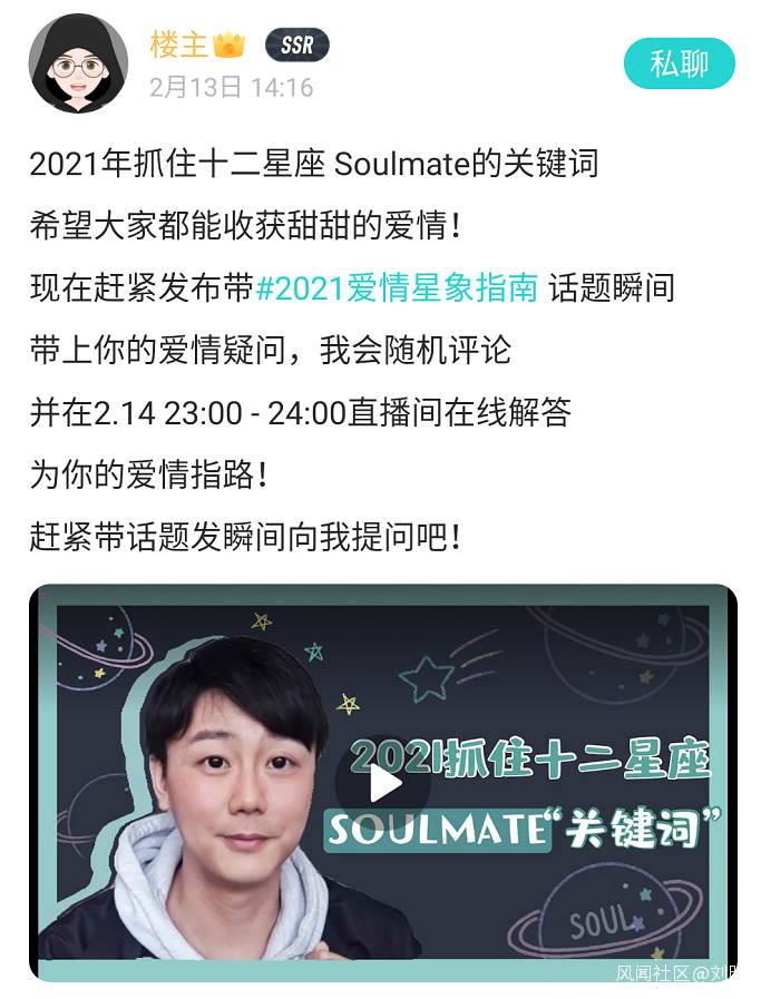 另外,Soul與頭部星座達人陶白白深度合作,入駐Soul後在未經推廣的情況下陶白白漲粉破萬,雙方定製的視頻一上線就衝進微博全站總榜前100,情人節晚間的特輯直播熱度高達537W。這都説明Soul正不斷破圈,實現從垂直細分到大眾流行的突破。