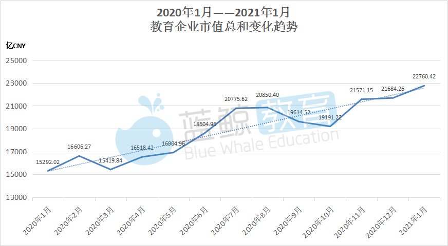 從上圖可以看出,教育上市企業市值在2020年上半年整體有較大幅度的上漲,下半年在9月和10月出現接連下跌,之後便一直保持穩定增長,在2021年1月末,市值高達22760.42 億人民幣,遠高於去年同期水平。
