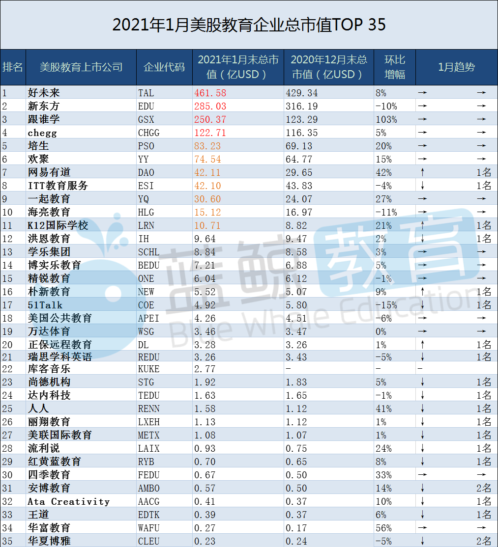 相比2020年的“突如其來”,大多數機構在2021年還是“有所準備”,但總體來説,線上教育企業依舊優勢凸顯,漲幅較為可觀,例如跟誰學(GSX)實現翻倍式增長,網易有道(DAO)也大幅上漲40%,好未來也小幅增長6%(TAL)……1月末教育企業整體市值又是變現如何?156家企業綜合排名又是如何?藍鯨教育智庫持續為您更新教育企業市值排行榜。