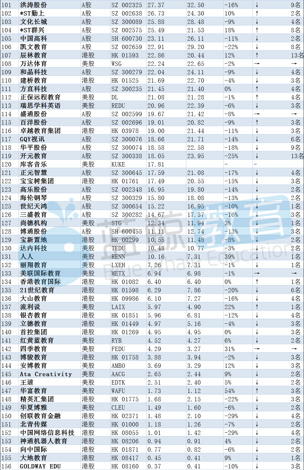 漲幅較大的企業有:跟誰學(GSX)上漲100%,華富教育(WAFU)上漲54%,電光科技(SZ 002730)上漲44%,網易有道(DAO)上漲40%,人人(RENN)上漲39%,四季教育(FEDU)環比增幅為31%,*ST融捷(SZ 002192)環比增幅為27%……