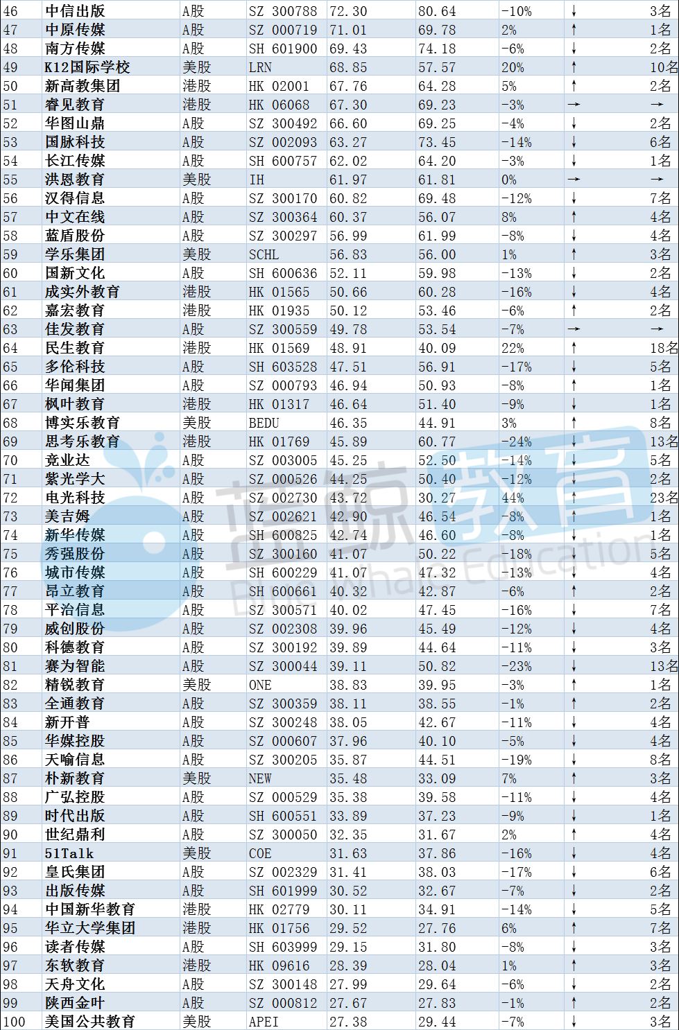 前30名中出現上漲的企業還有視覺中國(SZ 000681),上漲5%,市值95.63億元,位次上升6名至第12名;中原傳媒(SZ 000719)也有增長,上漲2%,市值71.01億元,位次上升1名至第25名……總體來看,A股教育上市公司TOP 30中有30%的企業市值出現上漲。