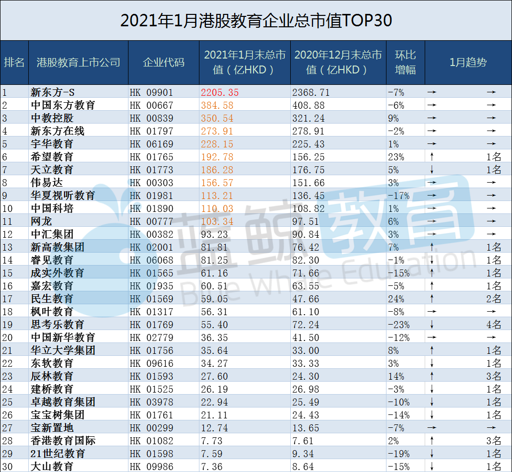 2021年1月市值下跌較多的企業有:東方時尚(SH 603377)下跌38%,創聯教育金融(HK 02371)下跌29%,中國網絡信息科技(HK 08055)下跌29%,開元教育(SZ 300338)下跌25%,思考樂教育(HK 01769)下跌24%,賽為智能(SZ 300044)下降23%;精英彙集團(HK 01775)下降22%……