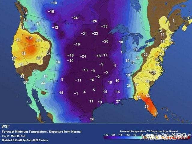 在寒潮肆虐下,德克薩斯州電網中風力發電被迫砍斷一半,這些支撐着德州四分之一電力供應的風力發電系統並沒有在極端嚴寒下運行的設計,因為這種情況在德克薩斯州很罕見。