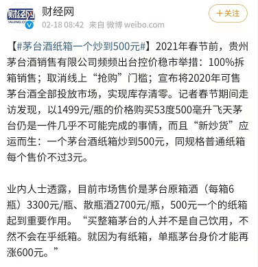 當然了,被吐槽的還不止這一點,2月18號,一則“茅台酒紙箱一個炒到500元”的消息更是讓人震驚。